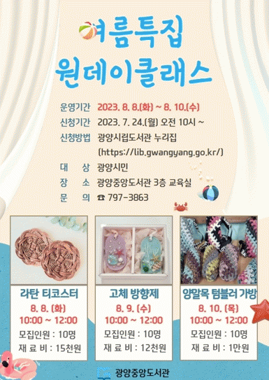 ÇÁ·Î±×·¥Àº ¡ã8¿ù 8ÀÏ ¶óź ƼÄÚ½ºÅÍ ¸¸µé±â ¡ã8¿ù 9ÀÏ °íü ¹æÇâÁ¦ ¸¸µé±â ¡ã8¿ù 10ÀÏ ¾ç¸»¸ñÀ¸·Î ÅÒºí·¯ °¡¹æ ¸¸µé±â µî 3°¡Áö·Î ±¸¼ºµÆ´Ù.