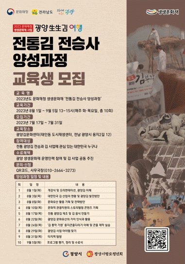 ¾ç¼º°úÁ¤Àº ¡â°³°½Ä ¹× ±¤¾ç±è ÀÌÇØ ¡â´ëÇѹα¹ ±è »ê¾÷ÀÇ ÇöȲ ¹× ±¤¾ç±è ¹ßÀü¹æ¾È ¡â¹®ÈÀ¯»ê Ȱ¿ë ±âȹ ¹× Àü·«¹æ¾È ¡â¹®ÈÀû °ü±¤ÀÚ¿øÀÇ ½ºÅ丮ÅÚ¸µ ÄÜÅÙÃ÷ ±âȹ ¡âÀüÅë ±¤¾ç±è Á¦Á¶ ¹× ±è À½½Ä ¸¸µé±â ¡â±¤¾ç±è ¹®ÈÀ¯»êÀÇ °¡Ä¡ Àνİú Ȱ¿ë ¡â¡®±è dzÀÛ ±â¿ø¡¯ ¿ëÁöÅ«Áٴٸ®±â ÀÌÇØ ¹× Å«ÁÙ Á¦ÀÛ ½Ç½À ¡â±¤¾ç±è »ç¾÷ ¾ÆÀÌÅÛ Ã£±â ¡âÀü±¹ ±è Ȱ¼ºÈ Áö¿ª Ž¹æ ¡âÇÁ·Î±×·¥ Æò°¡ ¹× ¼ö·á½Ä µî ÃÑ 10°³ °úÁ¤À¸·Î ÁøÇàµÈ´Ù.