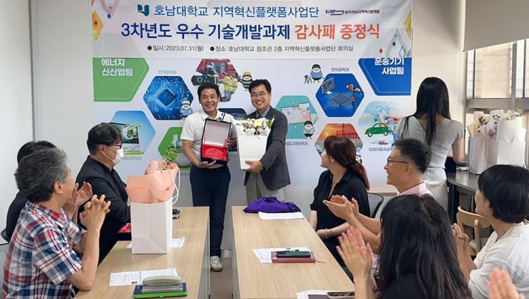 Á¤Á¦Æò »ç¾÷´ÜÀåÀº ¡°»ç¾÷´ÜÀÇ ±â¼ú°³¹ß°úÁ¦ ¼öÇà¿¡¼ ¿ì¼öÇÑ ¼º°ú¸¦ °ÅµÎ´Âµ¥ Èû½áÁֽŠÂü¿©Çаú ±³¼ö´Ôµé²² °¨»çÀÇ ¸¶À½À» ´ã¾Æ ÀÌ ÆÐ¸¦ Àü´ÞÇÑ´Ù¡±°í ¸»Çϸç, ¿ÃÇØ¿¡µµ ÁÁÀº ¼º°ú¸¦ µµÃâÇÒ ¼ö ÀÖµµ·Ï Èû½áÁֽñ⸦ ´çºÎÇß´Ù.