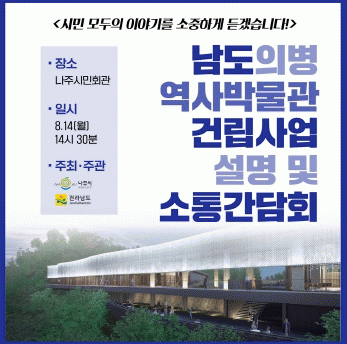 Àü¶ó³²µµ ³ªÁֽô ¿À´Â 14ÀÏ ¿ÀÈÄ 2½Ã 30ºÐºÎÅÍ ³ªÁֽùÎȸ°ü¿¡¼ ¡®³²µµÀǺ´¿ª»ç¹Ú¹°°ü °Ç¸³»ç¾÷ ¼³¸í ¹× ¼ÒÅë°£´ãȸ¡¯¸¦ °³ÃÖÇÑ´Ù°í 7ÀÏ ¹àÇû´Ù.