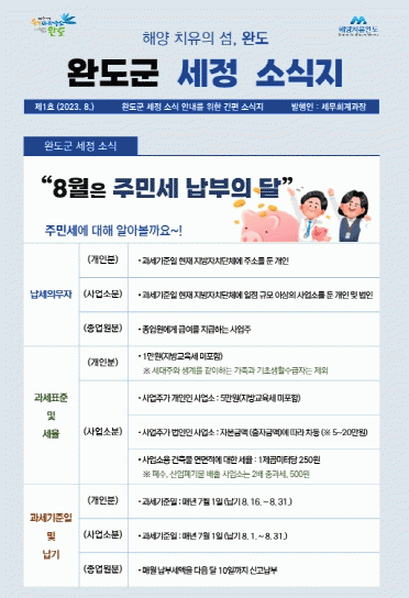 À̹ø¿¡ ¹ßÇàµÈ ù È£ ¡®¼¼Á¤ ¼Ò½ÄÁö¡¯¿¡´Â 8¿ù¿¡ ºÎ°úµÇ´Â Áֹμ¼ ¾È³»¿Í ÀÚµ¿Â÷¼¼ ¿¬³³ ½Åû µî ¾Ë¾ÆµÎ¸é À¯ÀÍÇÑ Áö¹æ¼¼ ÇÒÀÎ ÆÁ(Tip), °£´ÜÇÑ ¼¼±Ý °ü·Ã ±Ã±ÝÁõ¿¡ ´ëÇØ ¾Ë¾Æº¸´Â ³»¿ëÀ» ´ã°í ÀÖ´Ù.