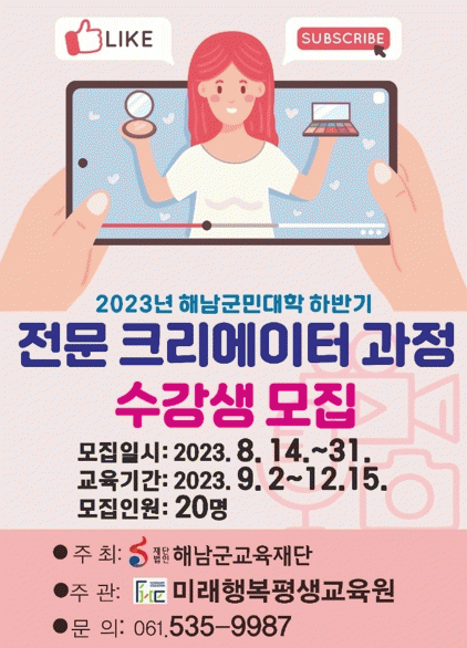 ±³À°Àº ´ÙÀ½´Þ 2ÀϺÎÅÍ 12¿ù 15ÀϱîÁö ¸ÅÁÖ Åä¿äÀÏ 30ÁÖ °úÁ¤À¸·Î °³¼³µÈ´Ù. Àü¹® Å©¸®¿¡ÀÌÅÍ·Î ¼ºÀåÇÒ ¼ö ÀÖµµ·Ï ¿µ»ó ÃÔ¿µ¹ýÀ» ºñ·ÔÇÑ ÆíÁý, ¿µ»ó¾ð¾î, À¯Æ©ºê Á¦ÀÛ¹ý µîÀ» ±³À°ÇÒ °èȹÀÌ´Ù.