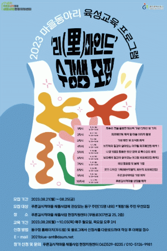 À̹ø ±³À°Àº ÀÌ´Þ 29ÀϺÎÅÍ 10¿ù 5ÀϱîÁö ¸ÅÁÖ ¿ù¡¤¸ñ¿äÀÏ¿¡ Ǫ¸¥±æ ½ÃÀÛ¸¶À» »õ¶ã»ç¾÷ ÇöÀåÁö¿ø¼¾ÅÍ¿¡¼ ÁøÇàµÈ´Ù. ÀÌ ±â°£ µ¿¾È ÆÐºê¸¯ ¼Òǰ °¡¹æ ¸¸µé±â¿Í ¾ÆÅ©¸± ÇÇÆ÷ ÆäÀÎÆÃ(À¯È ±×¸®±â) »óǰ Á¦ÀÛ µî ÃÑ 10ȸ Â÷·Î ¿î¿µµÉ ¿¹Á¤ÀÌ´Ù.