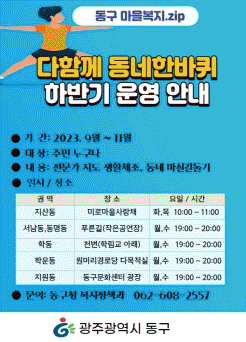 ¡®´ÙÇÔ²² µ¿³× ÇѹÙÄû¡¯´Â ¡®µ¿±¸ ¸¶À»º¹Áö. zip¡¯ ÀÏȯÀ¸·Î Àϻ󿡼 ÀÌ¿ô°ú ÇÔ²² ¿îµ¿ÇÏ´Â ºÐÀ§±â¸¦ Á¶¼ºÇϰí, ÁֹΠ°£ ¿¬´ë°¨ Çü¼ºÀ» À§ÇØ ±âȹµÆ´Ù. Àü¹®°¡ ÁöµµÇÏ¿¡ ¸¶À» ±¤Àå µî ÁֹΠ´Ù¼ö ÁýÇÕ Àå¼Ò¿¡¼ °Ç° üÁ¶¸¦ ÇÏ°í µ¿³× ¸¶½ÇÀ» ÇÏ°Ô µÈ´Ù.