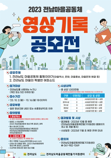 °ø¸ðÀüÀº Àü³²À» »ç¶ûÇÏ´Â ´©±¸³ª Âü¿©ÇÒ ¼ö ÀÖ´Ù. ¸¶À» ¸í¼Ò, µ¶Æ¯ÇÑ Áö¿ª¹®È, »ýÅÂ, Àι°, ÁֹΠȰµ¿°ú »îÀÇ ÇöÀå µî ¸¶À»ÀÇ Èï¹Ì·Ó°í Àç¹ÌÀÖ´Â À̾߱⸦ ¿µ»ó¿¡ ´ã¾Æ Àü³²¸¶À»°øµ¿Ã¼¸¸µé±âÁö¿ø¼¾ÅÍ·Î Á¢¼öÇÏ¸é µÈ´Ù.