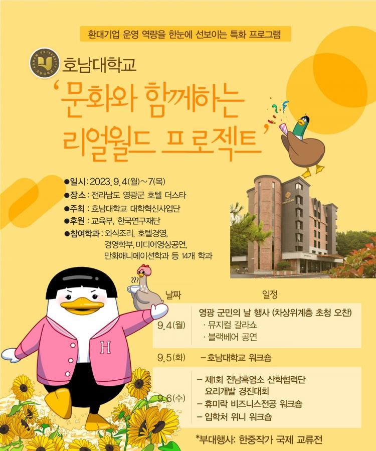 [ÅåÅå´º½º]È£³²´ëÇб³(ÃÑÀå ¹Ú»óö)°¡ È£ÅÚÀ» ÀÓÂ÷ÇØ 3¹Ú 4ÀÏ µ¿¾È ȯ´ë±â¾÷ ¿î¿µ¿¡ ÇÊ¿äÇÑ ¸ðµç °úÁ¤°ú ¹®È°ø¿¬À» ÀçÇлýµéÀÌ Á÷Á¢ ¼öÇàÇÏ¸é¼ ½Ç¹« ¿ª·®½ÀµæÀ» Áö¿øÇϴ Ưº° ÇöÀå ±³À°ÇÁ·Î±×·¥ ¡®2023 ¹®È¿Í ÇÔ²²ÇÏ´Â ¸®¾ó¿ùµå ÇÁ·ÎÁ§Æ®(Real World Project)¡¯¸¦ ¼±º¸ÀδÙ.
