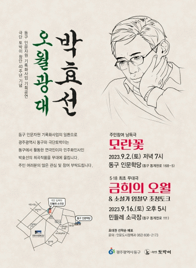 À̾î 9¿ù 16ÀÏ ¿ÀÈÄ 5½Ã ¹Îµé·¹¼Ò±ØÀå(µ¿±¸ µ¿°èõ·Î 111)¿¡¼ ÆîÄ¡´Â ¡®±ÝÈñÀÇ ¿À¿ù¡¯ °ø¿¬¿¡¼´Â ¹ÚÈ¿¼±°ú ÇÔ²² ±Ø´Ü ¡®±¤´ë¡¯¿¡¼ Ȱµ¿ÇÑ ¼Ò¼³°¡ ÀÓö¿ì ¾¾°¡ Ưº° ÃÊûµÅ 1980³â´ë ¹®È ¿îµ¿¿¡ ´ëÇÑ À̾߱⵵ µé·ÁÁÙ ¿¹Á¤ÀÌ´Ù. °ø¿¬ ÃÊ´ë±Ç µî ±âŸ ÀÚ¼¼ÇÑ »çÇ×Àº Àι®µµ½ÃÁ¤Ã¥°ú Àι®µµ½Ã±âȹ°è·Î ¹®ÀÇÇÏ¸é µÈ´Ù.