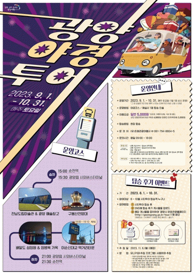 ±¤¾ç½ÃƼÅõ¾î´Â ¸ÅÁÖ Åä¿äÀÏ ¼øÃµ¿ª¿¡¼ ¿ÀÈÄ 3½Ã¿¡ Ãâ¹ßÇÏ´Â ¾ß°æÄÚ½º¸¦ »ó½Ã ¿î¿µÇϰí, ÆòÀÏ ¹× ÀÏ¿äÀÏ¿¡´Â ¾ß°æ, ¿ª»ç, ´Üü ÄÚ½º Áß ¿ì¼± ¿¹¾àµÈ ÄÚ½º·Î ¿î¿µÇÑ´Ù.