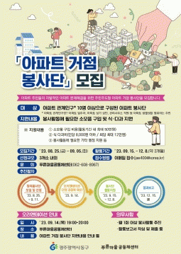¸ðÁý ´ë»óÀº °ü³» ¡®¾ÆÆÄÆ® °ü°è Àα¸¡¯ 10¸í ÀÌ»óÀÌ Âü¿©ÇÑ °øµ¿Ã¼ÀÌ´Ù. ¡®¾ÆÆÄÆ® °ü°è Àα¸¡¯´Â ¾ÆÆÄÆ® ÀÔÁÖÀÚ, ¾ÆÆÄÆ® »ó°¡ »óÀÎ, °ü¸®»ç¹«¼Ò Á÷¿ø µî ƯÁ¤ ¾ÆÆÄÆ® ³» »ýȰ±ÇÀ» °øµ¿ ¿µÀ§ÇÏ´Â ÁÖ¹ÎÀ» ÀÏÄ´´Ù.