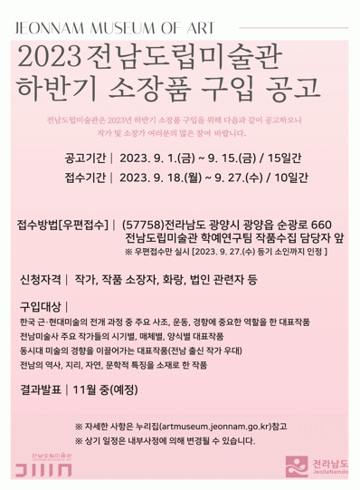 Á¢¼ö´Â ¿À´Â 27ÀϱîÁö·Î, ¿ìÆíÀ¸·Î¸¸ °¡´ÉÇÏ´Ù. °ø¸ð¿Í °ü·ÃÇÑ »ó¼¼ÇÑ ³»¿ëÀº Àü³²µµ¸³¹Ì¼ú°ü ´©¸®Áý¿¡¼ È®ÀÎÇÒ ¼ö ÀÖ´Ù.