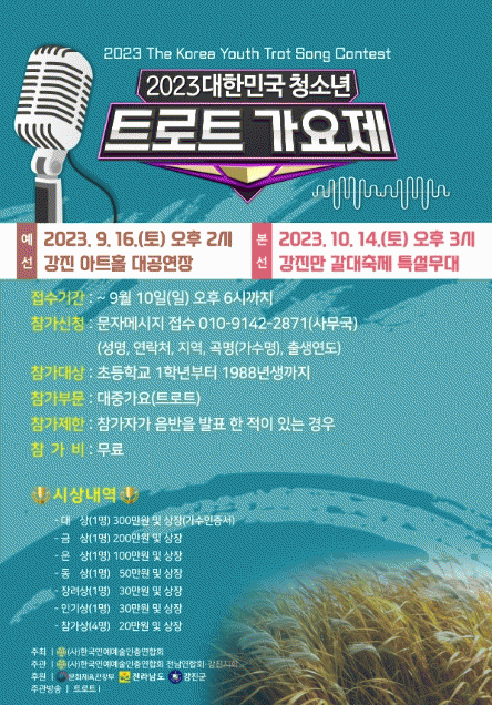 À̹ø 2023 ´ëÇѹα¹ û¼Ò³â Æ®·ÎÆ® °¡¿äÁ¦´Â ´ë»ó 1¸í¿¡°Ô »ó±Ý 300¸¸¿ø°ú °¡¼ö ÀÎÁõ¼¸¦ ÁÖ´Â »óÀåÀÌ ¼ö¿©µÇ¸ç ±× À̿ܿ¡µµ 9¸íÀÇ ½Ã»óÀÚ¿¡°Ô »óÀå ¹× »ó±ÝÀÌ ¼ö¿©µÉ ¿¹Á¤ÀÌ´Ù.