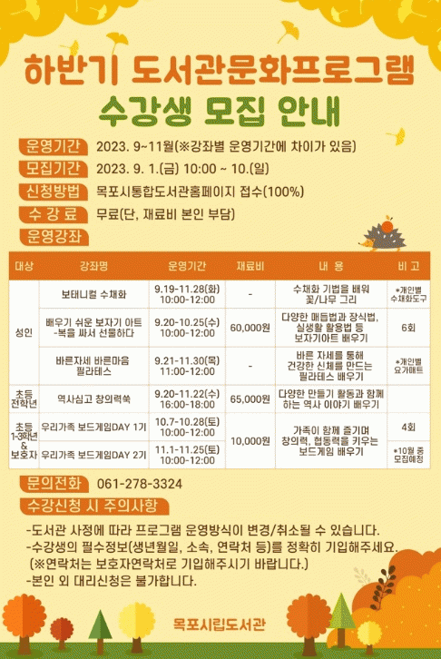 ¼ºÀÎ ´ë»óÀ¸·Î ¡®º¸Å´ÏÄà ¼öäȡ¯, ¡®¹è¿ì±â ½¬¿î º¸ÀÚ±â¾ÆÆ®¡¯, ¡®¹Ù¸¥ÀÚ¼¼ ¹Ù¸¥¸¶À½ ÇʶóÅ×½º¡¯ 3°³ °Á¸¦ ¿î¿µÇϸç, ÃʵîÇлý ´ë»óÀ¸·Î ¡®¿ª»ç ½É°í âÀÇ·Â ¾¦¾¦¡¯ °ÁÂ¿Í º¸È£ÀÚ¿Í ÇÔ²² Âü¿©ÇÏ´Â ¡®¿ì¸®°¡Á· º¸µå°ÔÀÓDAY¡¯¸¦ ¿î¿µÇÑ´Ù.