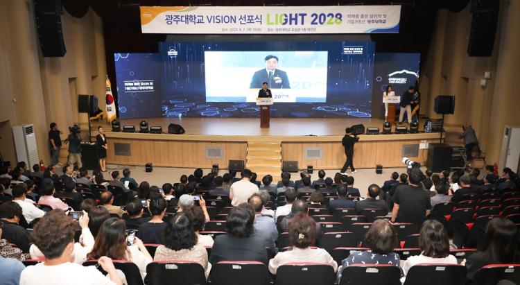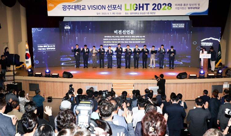 ±¤ÁÖ´ëÇб³´Â 9¿ù 7ÀÏ ¿ÀÈÄ 3½ÃºÎÅÍ ±³³» È£½É°ü 1Ãþ ´ë°´ç¿¡¼ ¡®LIGHT 2028¡¯ ºñÀü ¼±Æ÷½ÄÀ» °®°í, °±âÁ¤ ±¤ÁÖ±¤¿ª½ÃÀå°ú ÀÌÁ¤¼± ±¤Áֽñ³À°°¨À» ºñ·ÔÇØ Á¤Ä¡, °æÁ¦, »çȸ, ±³À°, ¾ð·Ð µî Áö¿ª»çȸ °¢°è ´ëÇ¥Àλç 50¿© ¸í, Çб³¹ýÀΠȣ½ÉÇпø ³ëÁø¿µ ÀÌ»çÀå, ±èµ¿Áø ÃÑÀåÀ» ºñ·ÔÇÑ ´ëÇÐ ±¸¼º¿ø µî ³»¿Üºó 750¿© ¸í°ú ÇÔ²² ±¤ÁÖ´ëÇб³ÀÇ ¹Ì·¡ ¹ßÀü ¹æÇâÀ» °øÀ¯Çß´Ù.