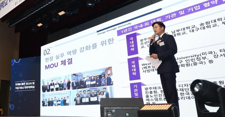 ±èµ¿Áø ÃÑÀåÀº ȯ¿µ»ç¸¦ ÅëÇØ ¡°ÇзÉÀα¸ ±Þ°¨ µî ±³À°È¯°æ º¯È¿Í 4Â÷ »ê¾÷Çõ¸í½Ã´ë¸¦ ¸Â¾Æ ¡®±¤ÁÖ´ëÇб³´Â ¾î¶»°Ô º¯ÈÇÒ °ÍÀΰ¡¡¯¶ó´Â °í¹Î ³¡¿¡ ¡®±â¾÷°¡Á¤½Å¡¯¿¡¼ ÇØ´äÀ» ã°í ¿À´Ã ºñÀü ¼±Æ÷½ÄÀ» °®°Ô µÆ´Ù¡±¸ç ¡°¹Ì·¡ÀÎÀç ¾ç¼ºÀ¸·Î Áö¿ª°ú ÇÔ²² ¼ºÀåÇÏ´Â ±â¾÷°¡Á¤½Å ´ëÇÐÀ» ½ÇÇöÇØ 100³â ¸í¹®»çÇÐÀÇ Æ°Æ°ÇÑ Åä´ë¸¦ ±¸ÃàÇϰí, ¼¼°è·Î »¸¾î³ª°¡´Â ±Û·ÎÄà ´ëÇÐÀ¸·Î ¼ºÀåÇϰڴ١±°í °Á¶Çß´Ù.