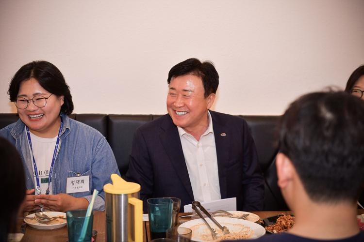 ½ÃÀå°ú Á÷¿ø°úÀÇ °ÝÀÇ ¾ø´Â ´ëȸ¦ À§ÇØ ½ÃûÀ» ¹þ¾î³ª ºê·±Ä¡ Ä«Æä¿¡¼ ÁøÇàµÈ °£´ãȸ¿¡¼ Á¤ ½ÃÀåÀº ¹Î¿ø ´ã´ç °ø¹«¿øÀÇ ¾Ö·Î»çÇ×À» Á÷Á¢ ûÃëÇÏ°í ³ë°í¸¦ °Ý·ÁÇß´Ù.