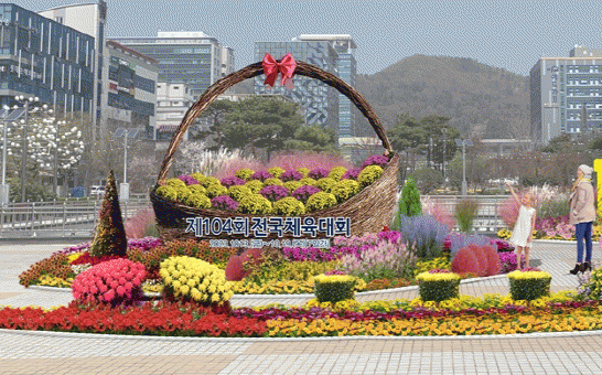 ÀÌ ´ëÇü ²ÉžÀº ±æÀÌ 6m, ³ôÀÌ 4mÀÇ ±¸Á¶¹°·Î Á¦104ȸ Àü±¹Ã¼À°´ëȸ ¹®±¸°¡ Àü¸é¿¡ »õ°ÜÁ® ÀÖ°í, ±¹È¿Í ÃÊÈ·ù 570º»À¸·Î ¾Æ¸§´ä°Ô ²Ù¸çÁ® ÀÖÀ¸¸ç Àü±¹Ã¼Àü È«º¸ ±Ø´ëÈ ¹× ¼º°øÀûÀÎ °³ÃÖ¸¦ ±â¿øÇϱâ À§ÇØ Àü³²µµÃ»°ú °¡±î¿î ³²¾ÇÁß¾Ó°ø¿ø¿¡ ¼³Ä¡µÆ´Ù.