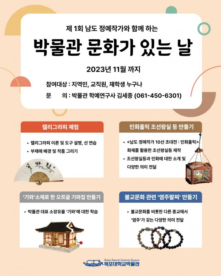 ¡®¹Ú¹°°ü ¹®È°¡ ÀÖ´Â ³¯¡¯Àº ¿ÃÇØ ¹Ú¹°°ü¿¡¼ ÁøÇàÇÏ´Â ¡®³²µµ Á¤¿¹ÀÛ°¡ 10¼± ÃÊ´ëÀü*¡¯°ú üÇè±³À°À» ¿¬°èÇÏ¿© ±¸¼ºÇß´Ù. ¹Ú¹°°ü °¶·¯¸® Àü½Ã¸¦ ±âȹÇÑ Å¥·¹ÀÌÅͰ¡ Á÷Á¢ ¾È³»Çϰí, Âü¿©ÀÚ°¡ ÀÛǰÀ» °ü¶÷Çϸç, À̸¦ ½º½º·Î üÇèÇØº¸´Â ¹æ½ÄÀÌ´Ù. üÇè°´ÀÌ ¡®¹Ì¼úÀÛ°¡¡¯°¡ µÇ¾î Àü½ÃµÈ ¿¹¼ú ÀÛǰÀ» º¸°í, µè°í, ½º½º·Î ¸¸µå´Â °æÇèÀ» ÅëÇØ ¸¸Á·µµ¸¦ ³ôÀ̰íÀÚ ±âȹµÇ¾ú´Ù.