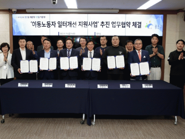 ¹Úº´±Ô ±¤»ê±¸Ã»ÀåÀº ¡°Åù衤¹è´Þ½ÃÀåÀÇ ±Þ°ÝÇÑ ¼ºÀå¿¡ ¹ÝÇØ ¿©ÀüÈ÷ À̵¿³ëµ¿ÀÚ°¡ Á¦µµÀû »ç°¢¿¡ ³õÀÎ »óȲ¿¡¼ À̹ø Çù¾àÀº ÇàÁ¤°ú ±â°ü, ±â¾÷ÀÌ ÈûÀ» ÇÕÃÄ ³ëµ¿ÀÚÀÇ »ý¸í°ú °Ç°, ±ÇÀÍÀ» º¸È£ÇÏ´Â ¾ÆÁÖ ÀÇ¹Ì ÀÖ´Â ¸ðµ¨ÀÌ µÉ °Í¡±À̶ó¸ç ¡°À̵¿³ëµ¿ÀÚ¸¦ À§ÇØ ±¤»ê±¸°¡ óÀ½ ½ÃµµÇÏ´Â ¹Î°£ Çù¾÷ÀÌ ±¤ÁÖ¸¦ ³Ñ¾î ´ëÇѹα¹ Àüü¿¡ ÀÛµ¿ÇÏ´Â Á¤Ã¥ÀÇ Ç¥ÁØÀÌ µÇµµ·Ï ÃÖ¼±À» ´ÙÇØ µÞ¹ÞħÇϰڴ١±°í ¹àÇû´Ù.