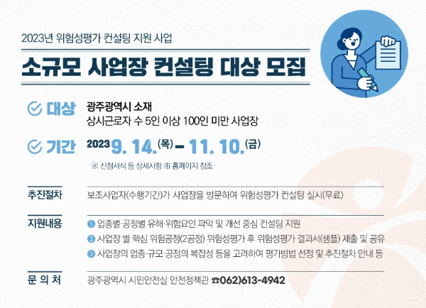 ÄÁ¼³ÆÃÀº º¸Á¶»ç¾÷ÀÚ°¡ »ç¾÷ÀåÀ» ¹æ¹®ÇØ »ç¾÷ÁÖ¡¤±Ù·ÎÀÚ¿Í ÇÔ²² »ç¾÷À庰 ÇÙ½É À§Çè°øÁ¤¿¡ ´ëÇÑ À¯ÇØ¡¤À§Çè¿äÀÎÀ» ÆÄ¾ÇÇϰí À̸¦ °³¼±ÇÏ´Â ¹æ¾ÈÀ» µµ¿ÍÁØ´Ù.