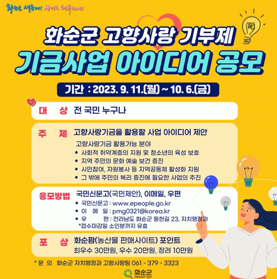 ȼø±º °íÇâ»ç¶û±âºÎÁ¦¿¡ °ü½É ÀÖ´Â ±¹¹Î ´©±¸³ª Âü¿©°¡ °¡´ÉÇϸç, °ø¸ð ºÐ¾ß´Â ¡â»çȸÀû Ãë¾à°èÃþÀÇ Áö¿ø ¹× û¼Ò³â À°¼º¡¤º¸È£ ¡âÁö¿ª ÁÖ¹ÎÀÇ ¹®È¡¤¿¹¼ú¡¤º¸°Ç ÁõÁø ¡â½Ã¹ÎÂü¿©, ÀÚ¿øºÀ»ç µî Áö¿ª°øµ¿Ã¼ Ȱ¼ºÈ Áö¿ø ¡â±× ¹ÛÀÇ ÁֹΠº¹¸® ÁõÁø¿¡ ÇÊ¿äÇÑ »ç¾÷ÀÌ´Ù.