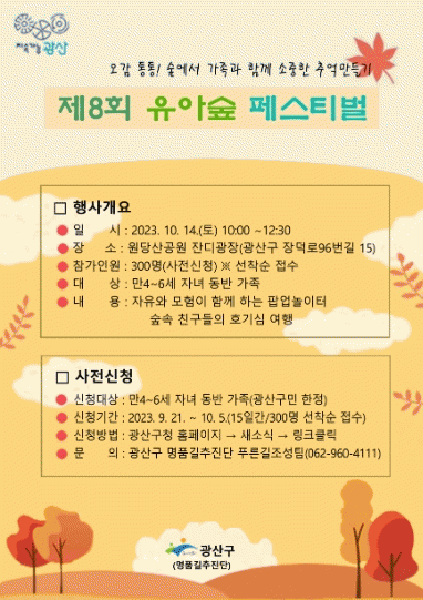 Âü¿©ÀÚ´Â ±¤»ê±¸¿¡ °ÅÁÖÇÏ´Â 6~8¼¼ À¯¾Æ µ¿¹Ý °¡Á· 300¸íÀ» ¼±Âø¼øÀ¸·Î ¸ðÁýÇÑ´Ù. ½ÅûÀº ±¤»ê±¸ ´©¸®Áý ¡®»õ¼Ò½Ä¡¯¶õÀ» Âü°íÇϰųª ±¤»ê±¸ ¸íǰ±æÃßÁø´Ü Ǫ¸¥±æÁ¶¼ºÆÀÀ¸·Î ÀüÈ ¹®ÀÇÇÏ¸é µÈ´Ù.