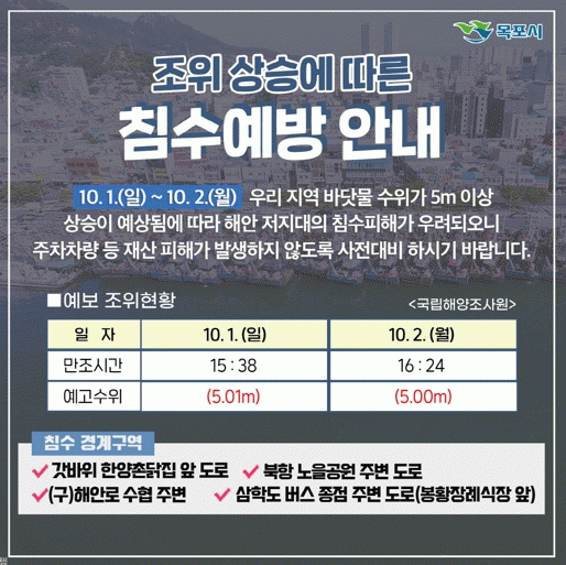 ÇÑÆí, ¸ñÆ÷½Ã´Â ¹Ù´å¹° ¼öÀ§°¡ Á¶¼®Ç¥»ó Á¶°í 4.90mÀÌ»óÀÏ °æ¿ì ÇØ¼ö À§ÇèÀÏ·Î ÁöÁ¤ÇÏ¿© ½Ã¹ÎµéÀÇ Àç»êÇÇÇØ°¡ ¹ß»ýÇÏÁö ¾Êµµ·Ï ħ¼öÇÇÇØ ¿¹¹æ¿¡ Àû±Ø ´ëóÇϰí ÀÖ´Ù.
