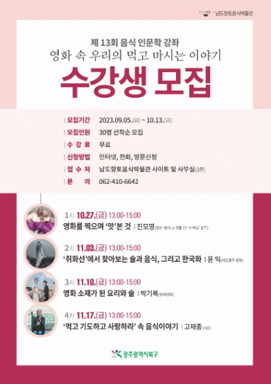 ¿ÃÇØ·Î 13¹øÂ°¸¦ ¸ÂÀº À̹ø °Á´ ¡®¿µÈ ¼Ó ¿ì¸®ÀÇ ¸Ô°í ¸¶½Ã´Â À̾߱⡯¸¦ ÁÖÁ¦·Î ³²µµÇâÅäÀ½½Ä¹Ú¹°°ü¿¡¼ ¿î¿µ ±â°£ Áß ¸ÅÁÖ ±Ý¿äÀÏ ¿ÀÈÄ 1½ÃºÎÅÍ 3½Ã±îÁö ȸ´ç 30¿© ¸íÀÇ ÁÖ¹ÎÀ» ´ë»óÀ¸·Î ÃÑ 4ȸ¿¡ °ÉÃÄ ÁøÇàµÈ´Ù.