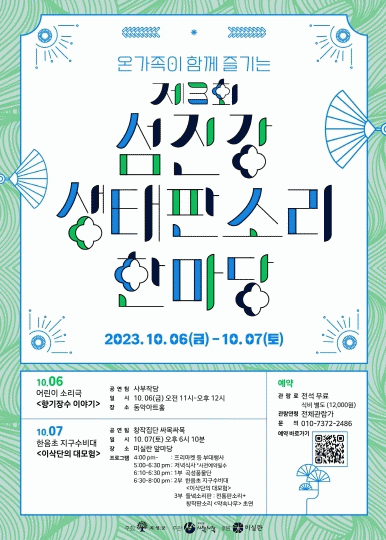 ¡®Á¦3ȸ ¼¶Áø° »ýÅ ÆÇ¼Ò¸® ÇѸ¶´ç¡¯Àº 10¿ù 6ÀÏ¿¡´Â ¿ÀÀü 11½Ã, 10¿ù 7ÀÏ¿¡´Â ¿ÀÈÄ 6½Ã 10ºÐ¿¡ ÁøÇàµÈ´Ù. Àü Á¼® ¹«·á·Î ÁøÇàµÇ¸ç ½Ä»çºñ´Â º°µµ´Ù. °ø¿¬ ¿¹¾àÀº Æ÷½ºÅÍ¿¡ ÀÖ´Â QRÄڵ带 ½ºÄµÇϰųª, ±¸±Û ÆûÀ¸·Î Á¢¼ÓÇØ ½ÅûÇÏ¸é µÈ´Ù. ÀÚ¼¼ÇÑ »çÇ×Àº ÆÇ¼Ò¸® ÇѸ¶´ç ±âȹÆÀÀ¸·Î ¹®ÀÇÇÏ¸é µÈ´Ù.