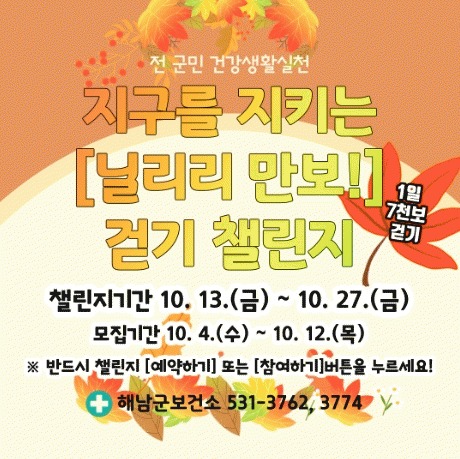 °È±â ¿îµ¿ Ȱ¼ºÈ¸¦ ÅëÇÑ °Ç°ÁõÁøÀ» À§ÇØ ½Ç½ÃµÇ´Â À̹ø 縰Áö´Â Àü ±º¹ÎÀ» ´ë»óÀ¸·Î 10¿ù 13ÀϺÎÅÍ 27ÀϱîÁö ¿öÅ©¿Â ¾ÛÀ» Ȱ¿ëÇØ ¿î¿µµÈ´Ù.