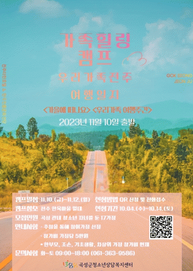 Âü°¡¸¦ Èñ¸ÁÇÏ´Â °¡Á·Àº ¿À´Â 14ÀϱîÁö °î¼º±º û¼Ò³â»ó´ãº¹Áö¼¾ÅÍ¿¡ ÀüÈ·Î ¹®ÀÇ ÈÄ ½Åû¼¸¦ Á¦ÃâÇÏ¸é µÈ´Ù. ÃÖÁ¾ Âü°¡ÀÚ´Â 10¿ù 17ÀÏ Ãß÷À» ÅëÇØ ¼±¹ßµÉ ¿¹Á¤ÀÌ´Ù. Ä·ÇÁ Âü°¡ºñ´Â °¡Á·´ç 5¸¸ ¿øÀÌ´Ù.