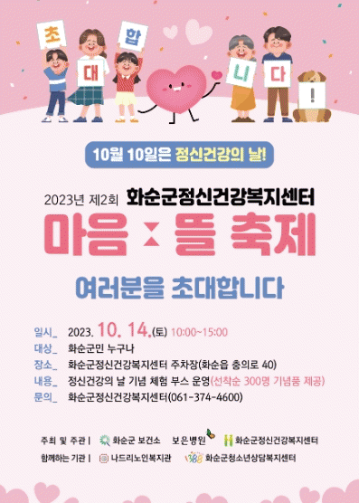 10¿ù 14ÀÏ ¿ÀÀü 10½ÃºÎÅÍ ¿ÀÈÄ 3½Ã±îÁö ȼø±º Á¤½Å°Ç°º¹Áö¼¾ÅÍ ÁÖÂ÷Àå¿¡¼ ÁøÇàµÇ´Â À̹ø ÃàÁ¦´Â ȼø±º Á¤½Å°Ç°º¹Áö¼¾ÅͰ¡ ÁÖ°üÇϸç ȼø±º º¸°Ç¼Ò, ³ªµå¸®³ëÀκ¹Áö°ü, ȼø±º û¼Ò³â »ó´ãº¹Áö¼¾ÅͰ¡ ÇÔ²² ´Ù¾çÇÑ Ã¼Çè °Å¸®¿Í Á¤º¸¸¦ Á¦°øÇÑ´Ù.