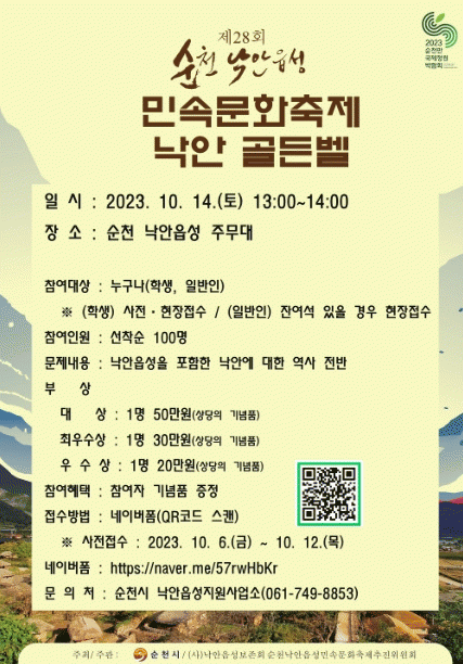 ÇÑÆí, Á¦28ȸ ¼øÃµ ³«¾ÈÀ¾¼º ¹Î¼Ó¹®ÈÃàÁ¦´Â ¿À´Â 13ÀϺÎÅÍ 15ÀϱîÁö 3Àϰ£ °³ÃֵȴÙ. ¾ÈÁß°É ÀÛ°¡ÀÇ Ä³¸®Ä¿ÃÄ µå·ÎÀ×¼î, ¹«·á ±â³ä»çÁø ÃÔ¿µ, ÀüÅëÈ¥·Ê, ¼º°û½×±â ¹× ¹éÁß³îÀÌ, ¼ö¹®Àå ±³´ë½Ä ¹× ±â¸¶À屺 ¼ø¶óÀǽÄ, ³«¾È °ñµçº§, ¹Î¼Ó³îÀÌ °æ¿¬´ëȸ, »ó¿©¼Ò¸® ÀçÇö µî ´Ùä·Î¿î Çà»ç°¡ ¸¶·ÃµÇ¾îÀÖ´Ù.