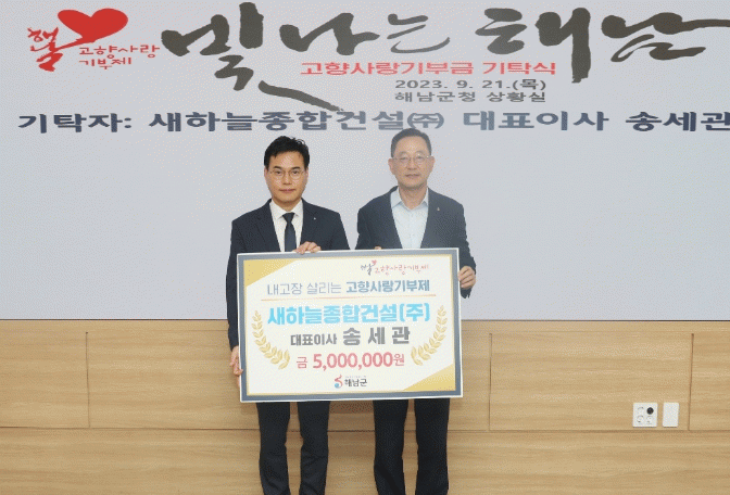 ¼Û¼¼°ü ´ëÇ¥ÀÌ»ç´Â¡°À̹ø °íÇâ»ç¶û±âºÎÁ¦ µ¿ÂüÀÌ °íÇâÀÎ ÇØ³²ÀÇ ¹ßÀü¿¡ Á¶±ÝÀ̳ª¸¶ µµ¿òÀÌ µÇ±æ ¹Ù¶õ´Ù¡±¸ç¡°¾ÕÀ¸·Îµµ ¿½ÉÈ÷ ³ë·ÂÇÏ´Â ¸ð¹üÀûÀÎ ±â¾÷À¸·Î¼ °íÇâ¹ßÀü¿¡ ÇÔ²²ÇØ ³ª°¡°Ú´Ù¡±°í ¹àÇû´Ù.