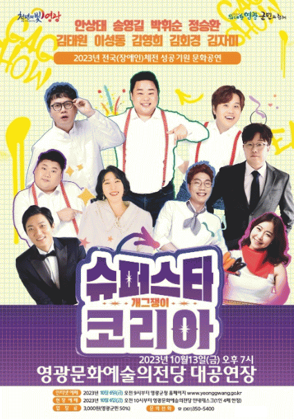 ¿µ±¤±ºÀº ¿À´Â 10¿ù 13ÀÏ ¿ÀÈÄ 7½Ã ¿µ±¤¹®È¿¹¼úÀÇÀü´ç ´ë°ø¿¬Àå¿¡¼ 2023³â Àü±¹(Àå¾ÖÀÎ)üÀü ¼º°ø±â¿ø ¹®È°ø¿¬À¸·Î¡®°³±×¼î-°³±×ÀïÀÌ ½´ÆÛ½ºÅ¸ ÄÚ¸®¾Æ¡¯¸¦ ¼±»çÇÑ´Ù.