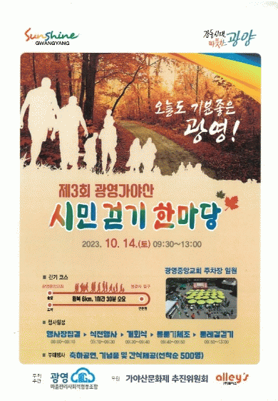 ¡®°¡¾ß»ê ½Ã¹Î °È±â ÇѸ¶´ç Çà»ç¡¯´Â ±¤¿µµ¿ ÁÖ¹ÎÀÇ ½°ÅÍÀÎ °¡¾ß»ê¿¡¼ °Ç°À» ÁõÁøÇϰí Áñ°Å¿î °È±â °æÇèÀ» Á¦°øÇØ ½Ã¹Î ¸ðµÎ°¡ ÈÇÕÇÏ´Â ÇѸ¶´ç Çà»ç·Î ±¤¿µµ¿¸¶À»°ü¸®»çȸÀûÇùµ¿Á¶ÇÕ¿¡¼ ÁÖ°üÇÑ´Ù.