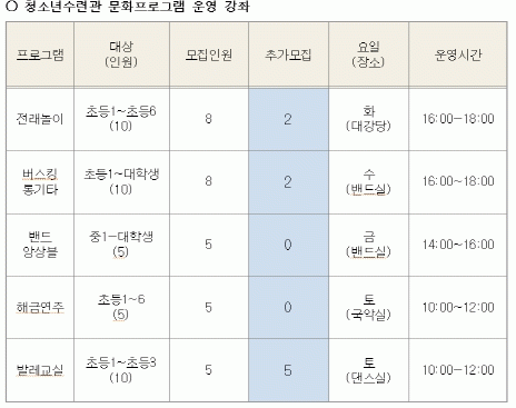 Âü¿© È¿À²À» ³ôÀ̱â À§ÇØ ÇÁ·Î±×·¥ÀÇ ¼±Á¤ ½Ã ÇÁ·Î±×·¥ ¿î¿µ ¹× °ü¸® Ȱµ¿ Àü¹Ý¿¡ ´ëÇØ °èȹ, ÇùÀÇÇÏ°í °³¼³ÇÏ¿© Áö¿ª û¼Ò³â ¸¸Á·µµ¿Í ¹æ°ú ÈÄ ¾ÆÄ«µ¥¹Ì¸¦ ÀÌ¿ëÇÑ Ã»¼Ò³âµéÀÇ ÀǰßÀ» Á¶»çÇÏ¿© ÇÁ·Î±×·¥À» Æí¼º, Àü·¡³îÀÌ, ¹ö½ºÅ·(ÅëŰŸ), ¹êµå, ÇØ±Ý ¿¬ÁÖ, ¹ß·¹ ±³½Ç µî 5°³ °Á¸¦ °³¼³¡¤¿î¿µÇÑ´Ù.