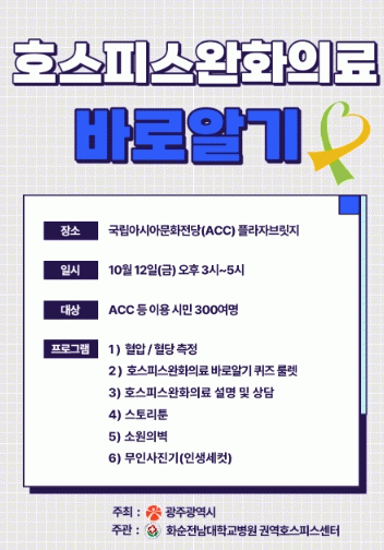 À̹ø Ä·ÆäÀÎÀº Á¦11ȸ È£½ºÇǽºÀÇ ³¯(10¿ù µÑ°ÁÖ Åä¿äÀÏ)À» ±â³äÇØ ±¤ÁÖ½Ã¿Í È¼øÀü³²´ëÇб³º´¿ø ±Ç¿ªÈ£½ºÇǽº¼¾ÅÍ, 3°³±¸ º¸°Ç¼Ò(µ¿±¸¡¤¼±¸¡¤³²±¸), ±¤ÁÖ¡¤Àü³²È£½ºÇǽºÀü¹®±â°ü, Á¦ÁÖÈ£½ºÇǽºÀü¹®±â°ü(6±Ç¿ª) µî 7°³ ±â°üÀÌ ÇÕµ¿À¸·Î ÁøÇàÇÑ´Ù.