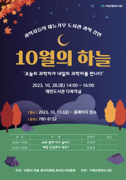 '10¿ùÀÇ ÇÏ´Ã' °úÇÐ °¿¬Àº Çѱ¹µµ¼°üÇùȸ°¡ ÁÖÃÖÇÏ´Â Çà»ç·Î ¸Å³â 10¿ù ¸¶Áö¸· Åä¿äÀÏ Àü±¹ Áß¼Òµµ½Ã 50°³ µµ¼°ü¿¡¼ ÇÔ²² ¿¸°´Ù. ´Ù¾çÇÑ ºÐ¾ßÀÇ °úÇÐ Àü°øÀÚµéÀÌ Çѱ¹µµ¼°üÇùȸ¿¡¼ ¼±Á¤ÇÑ µµ¼°ü¿¡¼ ±âºÎ °¿¬À» ÁøÇàÇÑ´Ù.