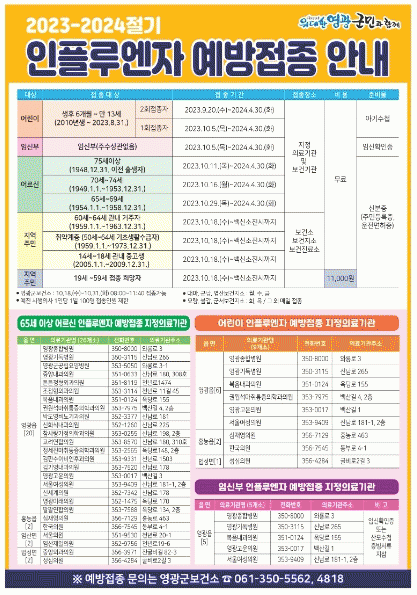 Á¢Á¾´ë»óÀº ¿µ±¤±º¿¡ ÁÖ¼ÒÁö¸¦ µÐ ¡ã60~64¼¼ ¡ã14~18¼¼ ¡ã50¼¼ÀÌ»ó ±âÃÊ»ýȰ¼ö±ÞÀÚ ¡ã½ÉÇÑÀå¾Ö(±¸.1~3±Þ) ¡ã±¹°¡À¯°øÀÚ(º»ÀÎ)·Î ½ÅºÐÁõ ¹× Áõºù¼·ù¸¦ ÁöÂüÇÏ¸é º¸°Ç¼Ò(Áö¼Ò¡¤Áø·á¼Ò)¿¡¼ ¹«·á ¿¹¹æÁ¢Á¾À» ¹ÞÀ» ¼ö ÀÖ´Ù. ±× ¿Ü ¿µ±¤±º¹Î, Ÿ Áö¿ª °ÅÁÖÀÚ´Â À¯·áÁ¢Á¾ÀÌ °¡´ÉÇϸç, Á¢Á¾ºñ´Â 11,000¿øÀÌ´Ù.