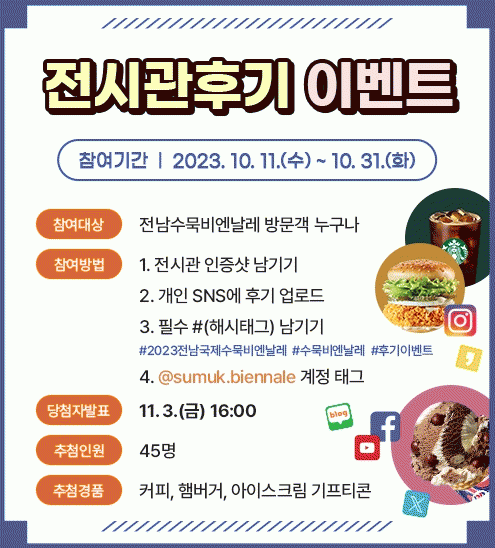 Àü½Ã°ü Èıâ À̺¥Æ®´Â °³ÀÎ ´©¸®¼ÒÅë¸Á¿¡ Àü½Ã°ü °ü¶÷(»çÁø) Èı⸦ ¿Ã¸®°í ´©¸®¼ÒÅë¸Á Çʼö ÇØ½Ãű×(@sumuk.biennale, #2023 Àü³²±¹Á¦¼ö¹¬ºñ¿£³¯·¹, #¼ö¹¬ºñ¿£³¯·¹, #Èıâ À̺¥Æ®)¸¦ ³²±â¸é µÈ´Ù.