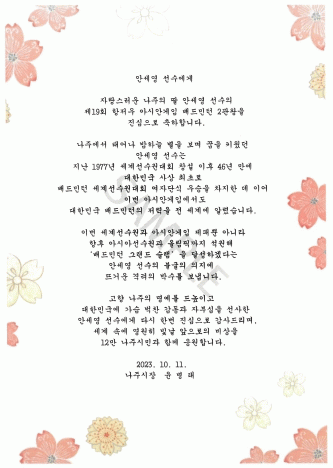 À±º´Å ³ªÁÖ½ÃÀåÀÌ Ç×Àú¿ì ¾Æ½Ã¾È°ÔÀÓ¿¡¼ ¹èµå¹ÎÅÏ 2°ü¿ÕÀ» Â÷ÁöÇÑ ¾È¼¼¿µ ±¹°¡´ëÇ¥¿¡°Ô ÃàÀüÀ» º¸³Â´Ù°í 12ÀÏ ¹àÇû´Ù.