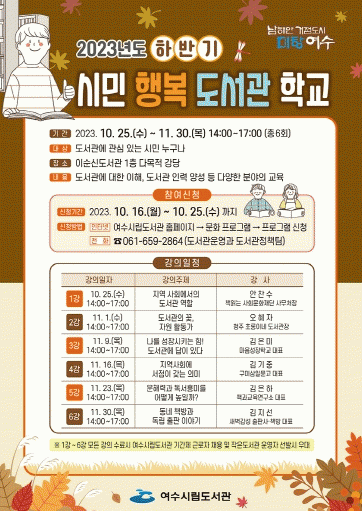 ÇϹݱ⿡´Â À̼ø½Åµµ¼°ü 1Ãþ ´Ù¸ñÀû °´ç¿¡¼ µµ¼°ü¿¡ °ü½É ÀÖ´Â ½Ã¹Î 50¿© ¸íÀ» ´ë»óÀ¸·Î µµ¼°ü ¹× µ¶¼¡¤¹®È °ü·Ã Áö½Ä°ú Á¤º¸¸¦ ¹ÙÅÁÀ¸·Î ÃÑ 6°ÀÇ °¿¬ÀÌ ¿î¿µµÈ´Ù.