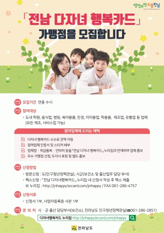 ¡®Àü³² ´ÙÀÚ³à Çູīµå¡¯ ¹ß±Þ ´ë»óÀÚ´Â µµ³»¿¡ ÁÖ¼Ò¸¦ µÐ ¸¸ 13¼¼ ÀÌÇÏ 2ÀÚ³à ÀÌ»ó(ÅÂ¾Æ Æ÷ÇÔ)ÀÎ ´ÙÀÚ³à °¡Á¤ÀÌ´Ù. Ä«µå ¹ß±ÞÀ» ¿øÇÏ´Â ±º¹ÎÀº °¡±î¿î ³óÇùÀ» ¹æ¹®Çؼ ½ÅûÇÏ¸é µÈ´Ù.