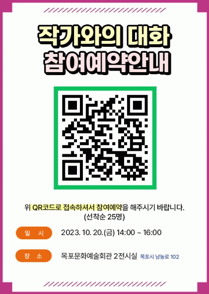 ÀÛ°¡¿ÍÀÇ ´ëÈ »çÀü ¿¹¾àÀº Àü³²±¹Á¦¼ö¹¬ºñ¿£³¯·¹ °ø½Ä ´©¸®Áý ÆË¾÷â Á¤º¸¹«´Ì(QRÄÚµå)·Î Á¢¼ÓÇØ ½ÅûÇÏ¸é µÈ´Ù.