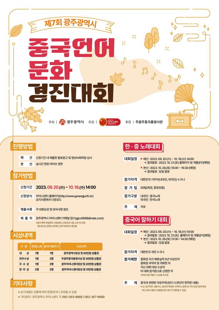 ±¤ÁÖ-Áß±¹ÀÇ ¿ìÈ£±³·ù ÁõÁø°ú ±Û·Î¹ú ÀÎÀç À°¼ºÀ» À§ÇØ ¸¶·ÃµÇ´Â ¡®±¤ÁÖ±¤¿ª½Ã Áß±¹¾ð¾î¹®È °æÁø´ëȸ¡¯´Â Àü±¹ ÃÊ¡¤Áß¡¤°í, ´ëÇлý°ú ¼ºÀÎÀ» ´ë»óÀ¸·Î ÇÏ´Â Áß±¹¾î ¸»Çϱ⠴ëȸ¿Í, ´ëÇѹα¹ °ÅÁÖ ¿Ü±¹Àΰú ´ëÇѹα¹ ´©±¸³ª Âü°¡ÇÒ ¼ö ÀÖ´Â ÇÑ¡¤Áß ³ë·¡ °æ¿¬ ´ëȸ·Î ³ª´µ¾î ÁøÇàµÈ´Ù.