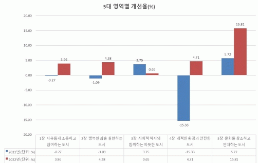 5´ë ºÐ¾ß Áß ¡®¹®È¸¦ âÁ¶ÇÏ°í ¿¬´ëÇÏ´Â µµ½Ã¡¯ ¿µ¿ªÀÌ 15.8%·Î °³¼±À²ÀÌ °¡Àå ³ô¾ÒÀ¸¸ç, ¡®»çȸÀû ¾àÀÚ¿Í ÇÔ²²ÇÏ´Â µû¶æÇÑ µµ½Ã¡¯ ¿µ¿ª °³¼±À²ÀÌ 0.7%·Î °¡Àå ³·°Ô ³ªÅ¸³µ´Ù.