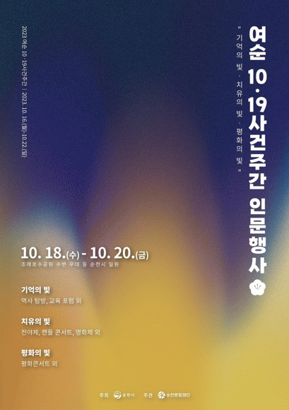 À̹ø Çà»ç´Â ¿©¼ø 10¡¤19 »ç°ÇÀÌ °®´Â ¿ª»çÀû Á߿伺À» Áö¿ª¹ÎÀÌ Á» ´õ ½±°Ô ±â¾ïÇÏ°í °ø°¨ÇÒ ¼ö ÀÖµµ·Ï ´Ù¾çÇÑ ¹®È¿¹¼ú Çà»ç·Î ÁøÇàµÉ ¿¹Á¤ÀÌ´Ù. ¿©¼ø 10¡¤19»ç°ÇÀÇ ¿ª»çÀû ¾ÆÇÄÀ» ¡®ºû¡¯À̶ó´Â ¸Å°³Ã¼¸¦ ÅëÇØ ±â¾ïÇϰí, À¯°¡Á·°ú Áö¿ª¹ÎÀÇ Ä¡À¯¿Í À§·Î, ÆòÈ¿Í ÈÇØ¸¦ À½¾Ç°ú ¹«¿ëÀ¸·Î Ç®¾î³»´Â ÀÚ¸®¸¦ ¸¶·ÃÇß´Ù.