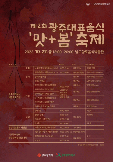 ±¤ÁÖ´ëÇ¥À½½Ä ÃàÁ¦´Â ±¤ÁÖ¸¦ ´ëÇ¥ÇÏ´Â À½½ÄÀ» ¼ÒÀç·Î ´Ù¾çÇÑ Ã¼Çè°ú °æ¿¬ÀÇ ÀåÀ» ¸¶·ÃÇÏ¿© ±¤ÁÖÀÇ ¸ÀÀ» °øÀ¯Çϰí ÁֹεéÀÌ ¾î¿ì·¯Áú ¼ö ÀÖ´Â °ø¿¬À» Á¦°øÇØ Áö¿ª À½½Ä ¹®È üÇèÀÇ ¸ÞÄ«ÀÎ ³²µµÇâÅäÀ½½Ä¹Ú¹°°üÀ» ³Î¸® ¾Ë¸®°íÀÚ ÃßÁøµÇ´Â Çà»çÀÌ´Ù.