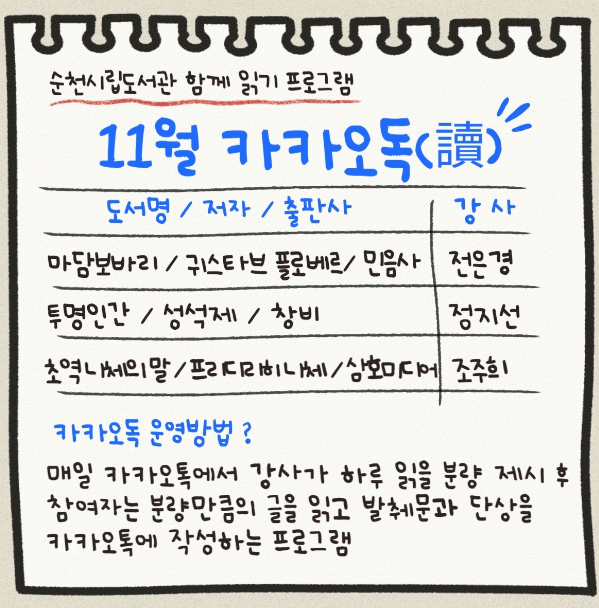 ¿î¿µÀº īī¿ÀÅå ´Üü´ëȹ濡 Áöµµ °»ç°¡ ¸ÅÀÏ ÀÐÀ» ºÐ·®°ú ÇÔ²² ¸®µå¹®(Ã¥À» Àдµ¥ µµ¿òÀÌ µÇ´Â ±Û)À» ¿Ã¸®¸é, Âü¿©ÀÚµéÀÌ ±×³¯ ÀÐÀº ºÐ·® Áß Àλó ±íÀº ±¸Àý°ú ªÀº °¨»óÆòÀ» °øÀ¯ÇÏ´Â ¹æ½ÄÀ¸·Î ÁøÇàµÈ´Ù.