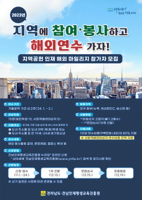 Àü³²µµÀÇ ¡®Áö¿ª°øÇå ÀÎÀç ÇØ¿Ü ¸¶Àϸ®Áö¡¯´Â Áö¿ª°øµ¿Ã¼¿¡ Âü¿©ÇÏ°í ºÀ»çÇÑ ½ÇÀûÀ» Åä´ë·Î Áö¿ª û¼Ò³â¿¡°Ô ¼±ÁøÁö ÇØ¿Ü¿¬¼ö ±âȸ¸¦ Á¦°øÇÏ´Â »ç¾÷ÀÌ´Ù.